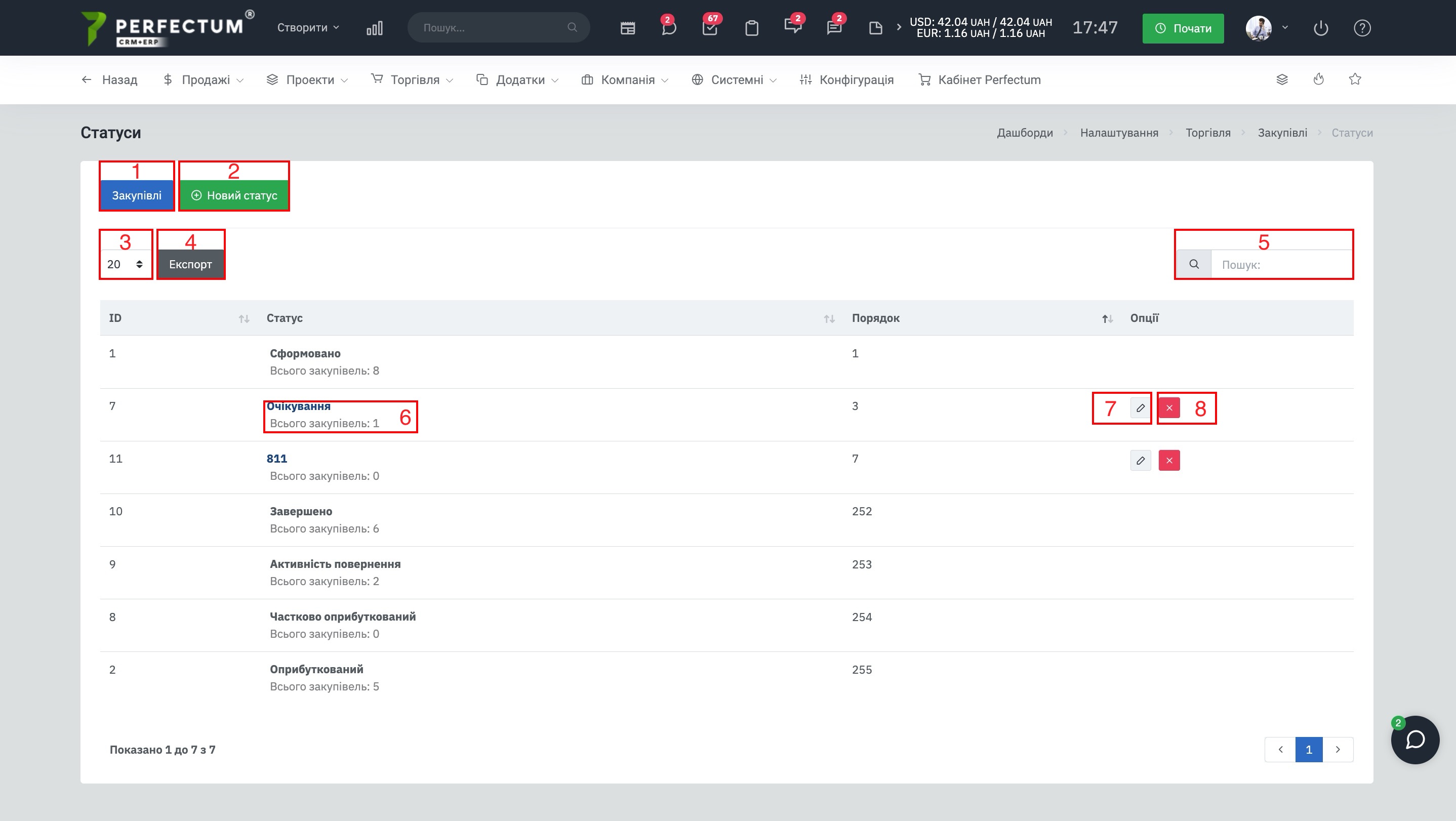 Для просмотра/редактирования статусов закупки перейдите "Настройки -> Торговля -> Закупки -> Статусы". После чего будет доступно: