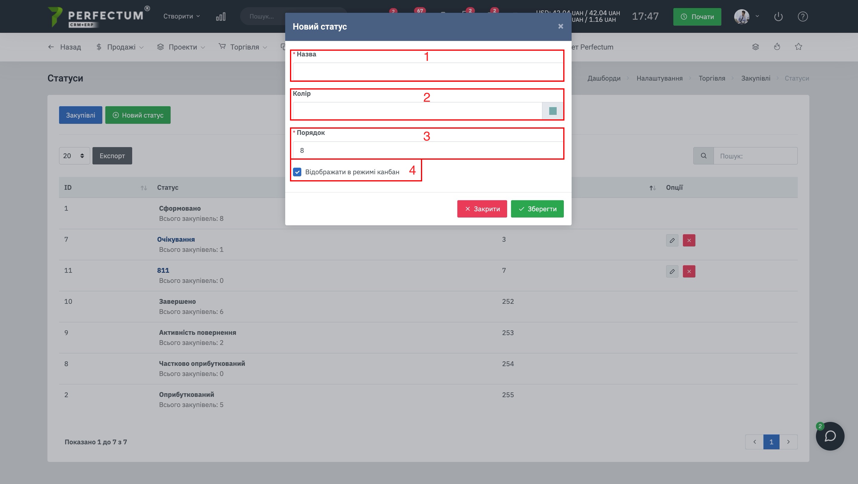 Для добавления нового статуса закупки перейдите "Настройки -> Торговля -> Закупки -> Статусы", нажмите на кнопку "Новый статус" далее заполните поля: