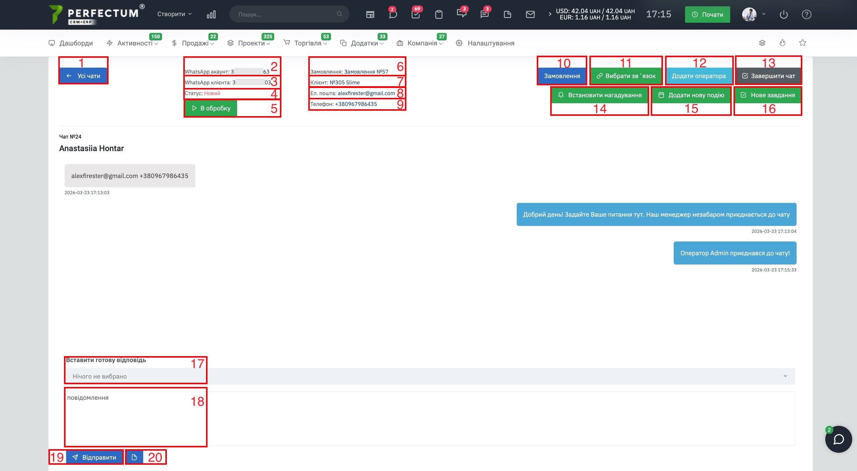 - Информация про связь чата, информация в данном поле зависит от созданной связи (лид/контакт/заказ).