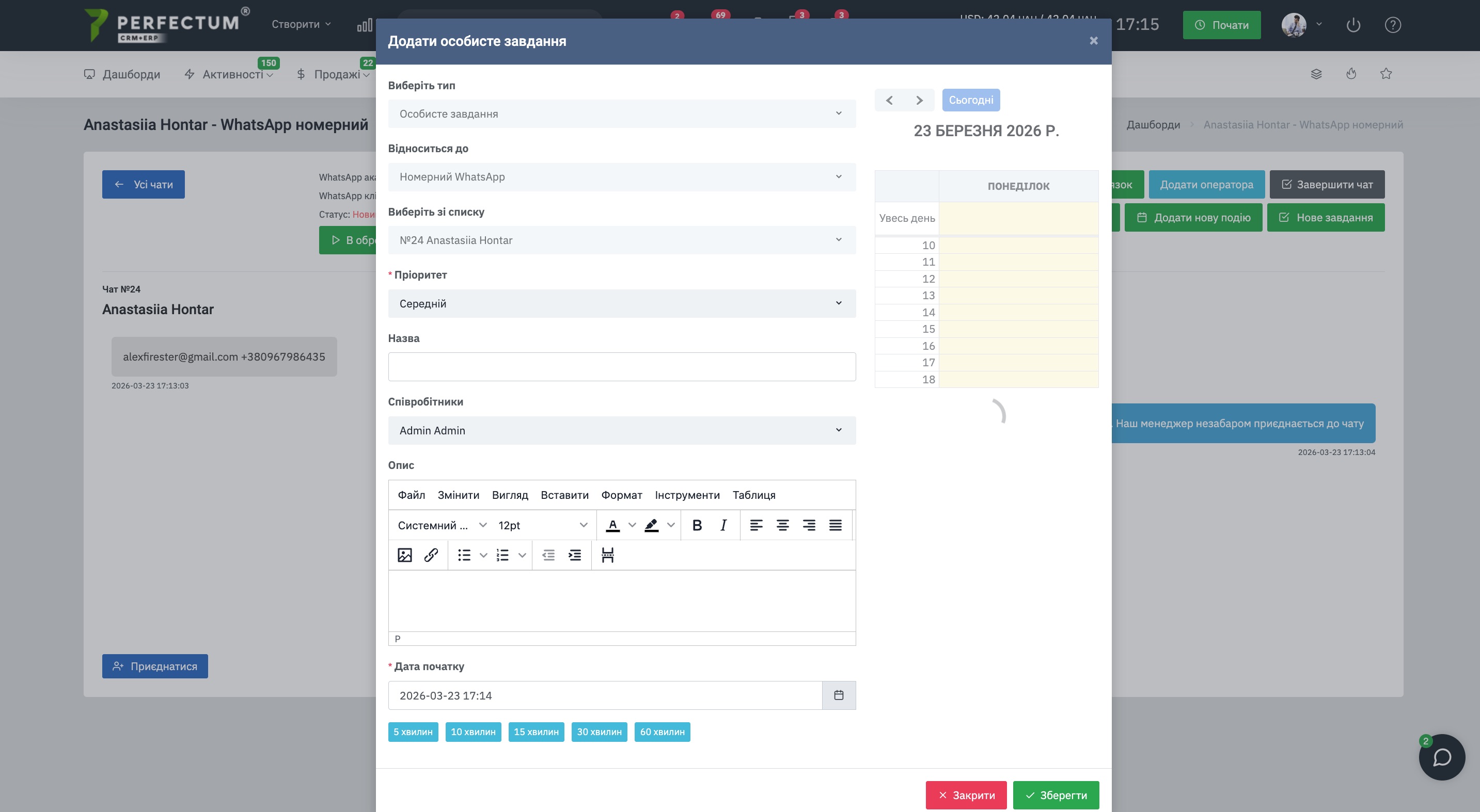 Заполните необходимые поля для создания личного задания связанного с чатом.