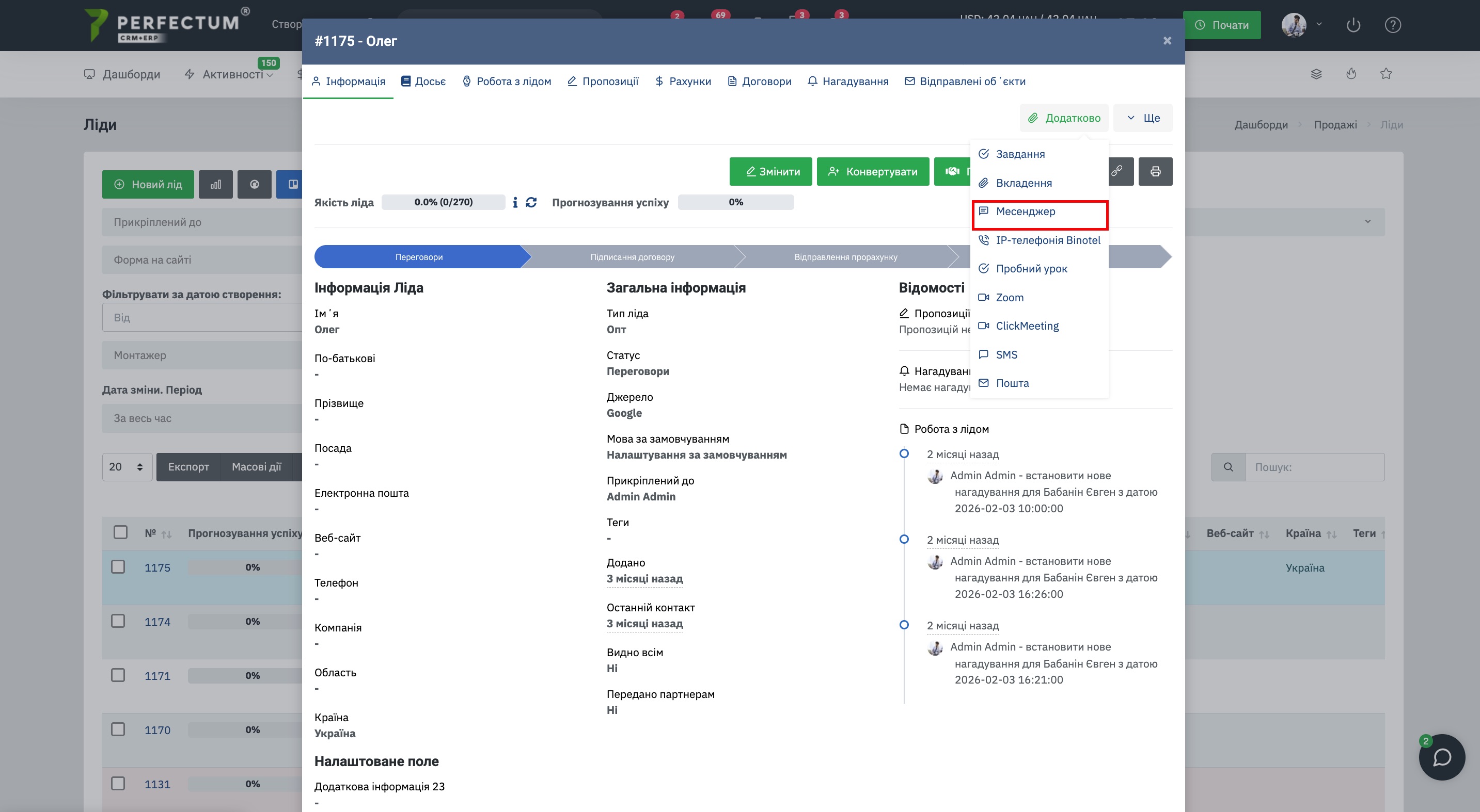 В карте лида чаты отображаются по пути: кнопка "Дополнительно - Мессенджер".