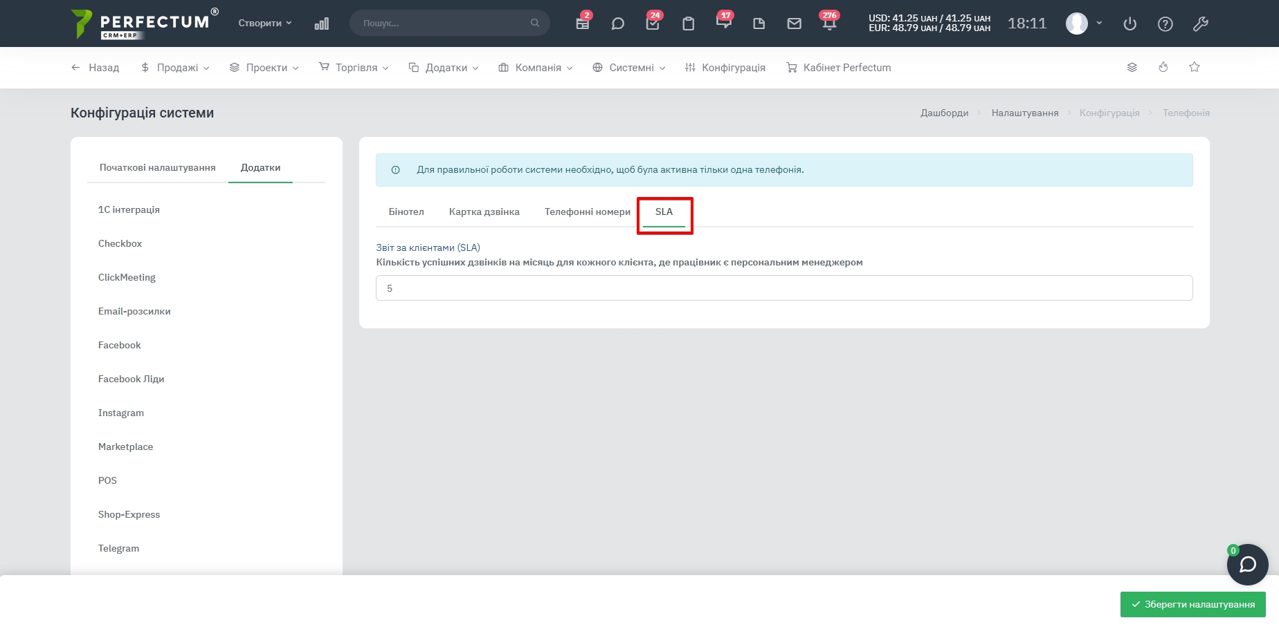 В настройки модуля добавлена настройка SLA, где можно указать, какое количество успешных звонков в месяц должно быть сделано одному клиенту.