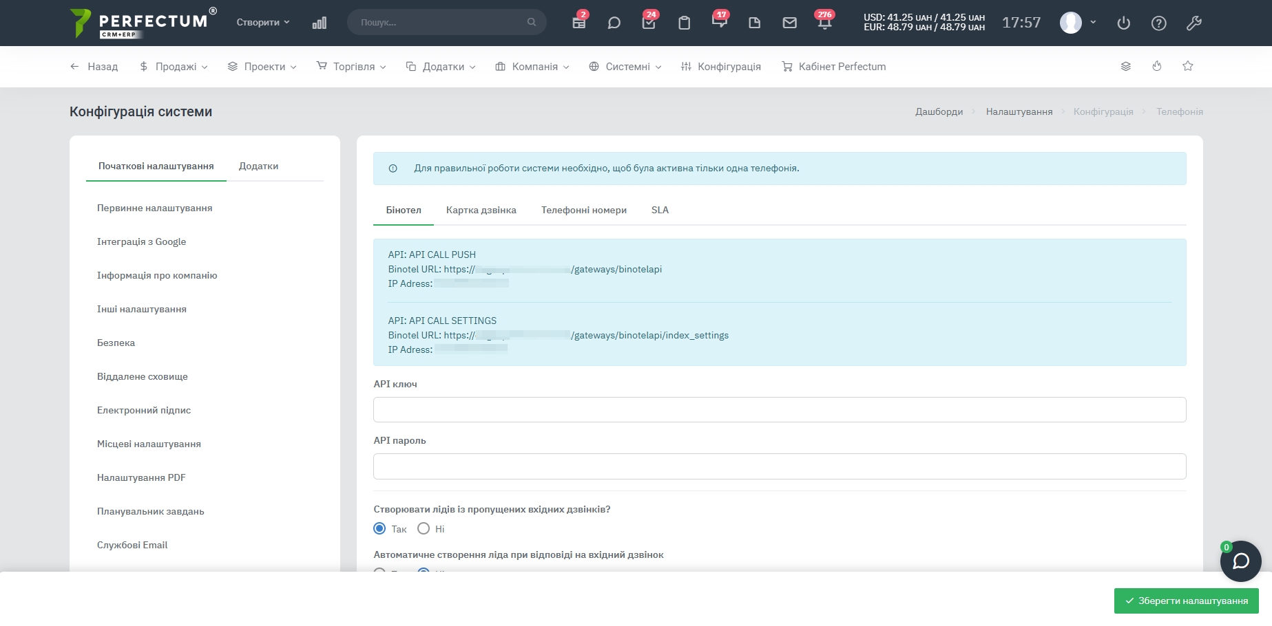 Binotel URL: https://domain.perfectum.one/binotelapi - адрес для интеграции с Perfectum CRM+ERP. Предоставьте этот путь (ссылку) службе поддержки Binotel Важно! Пишите с почты, на которую зарегистрирована ваша учетная запись Binotel!