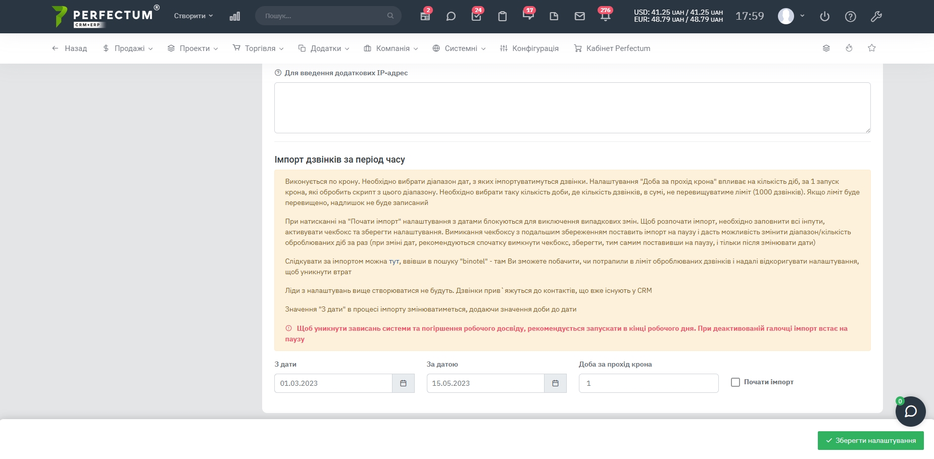 Следить за импортом можно здесь, введя в поиске "binotel" - там Вы сможете увидеть, попали ли в лимит обрабатываемых звонков и в дальнейшем откорректировать настройки, чтобы избежать потерь.