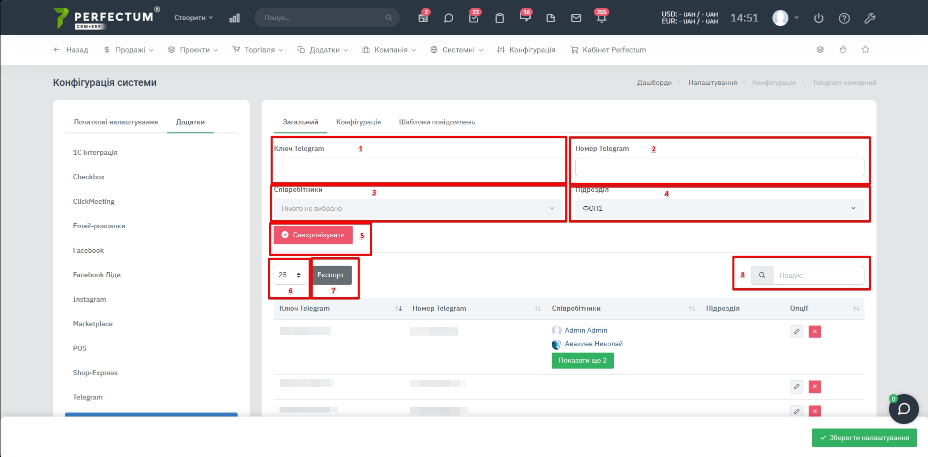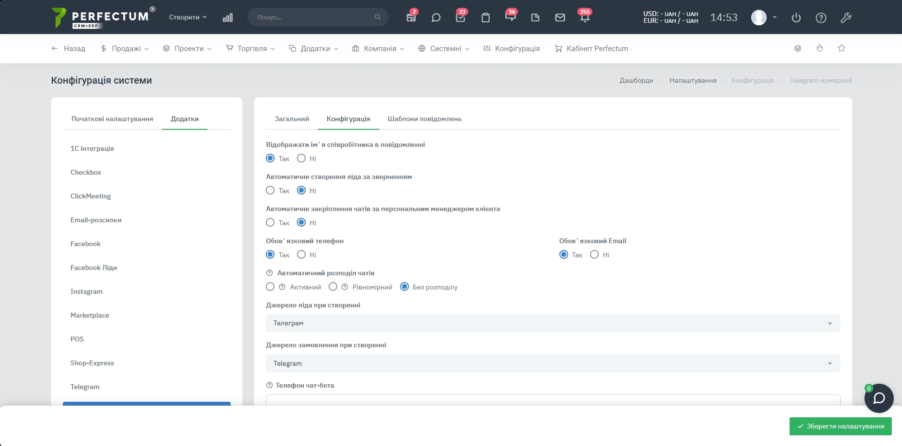 Для настройки модуля перейдите по пути: "Настройки - Конфигурация - Приложения - Номерной Telegram"