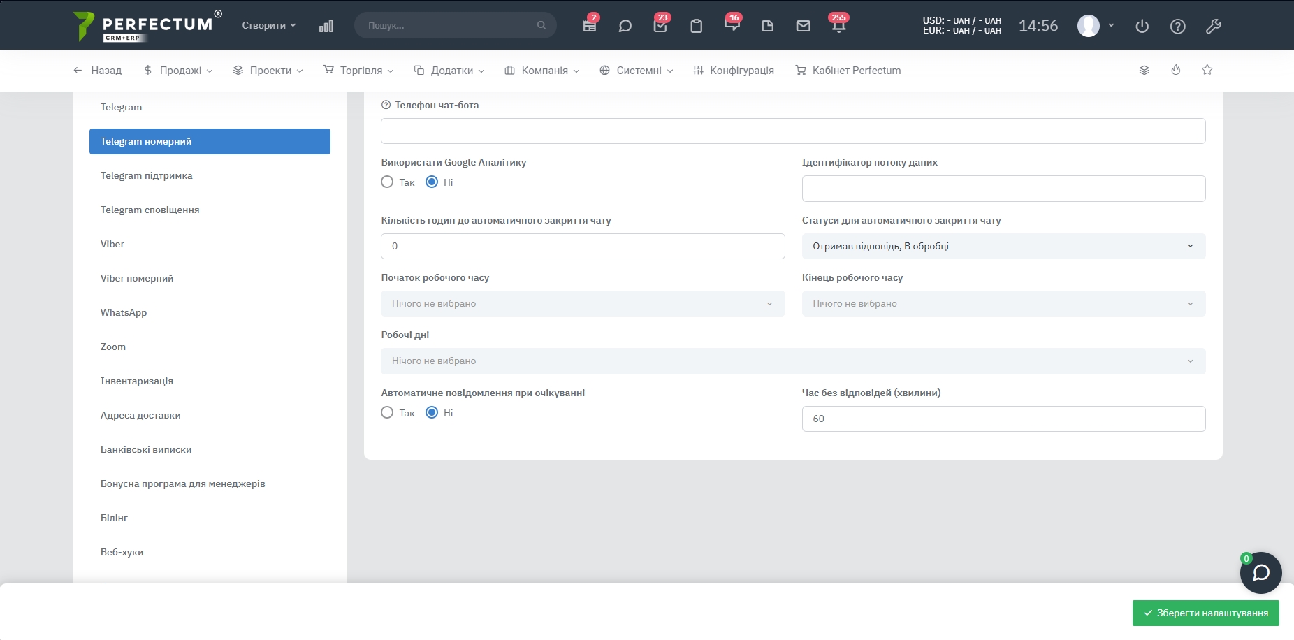 Командой Perfectum CRM+ERP разработан модуль "Номерной Telegram", который дает возможность осуществлять коммуникацию с клиентами.