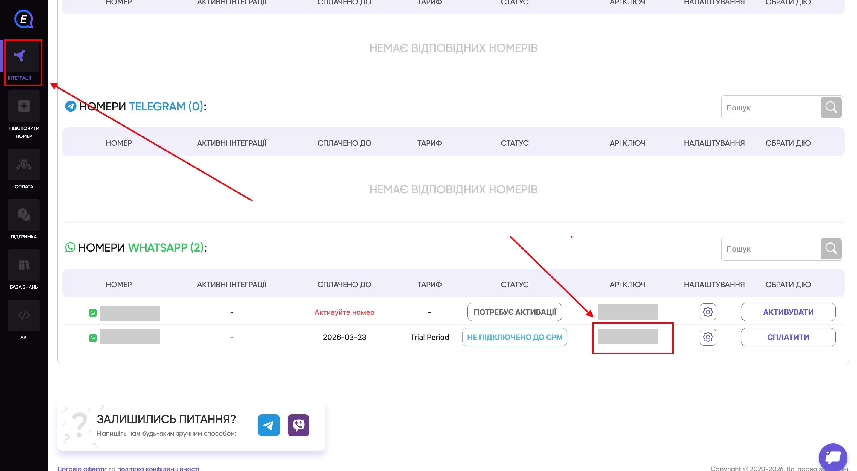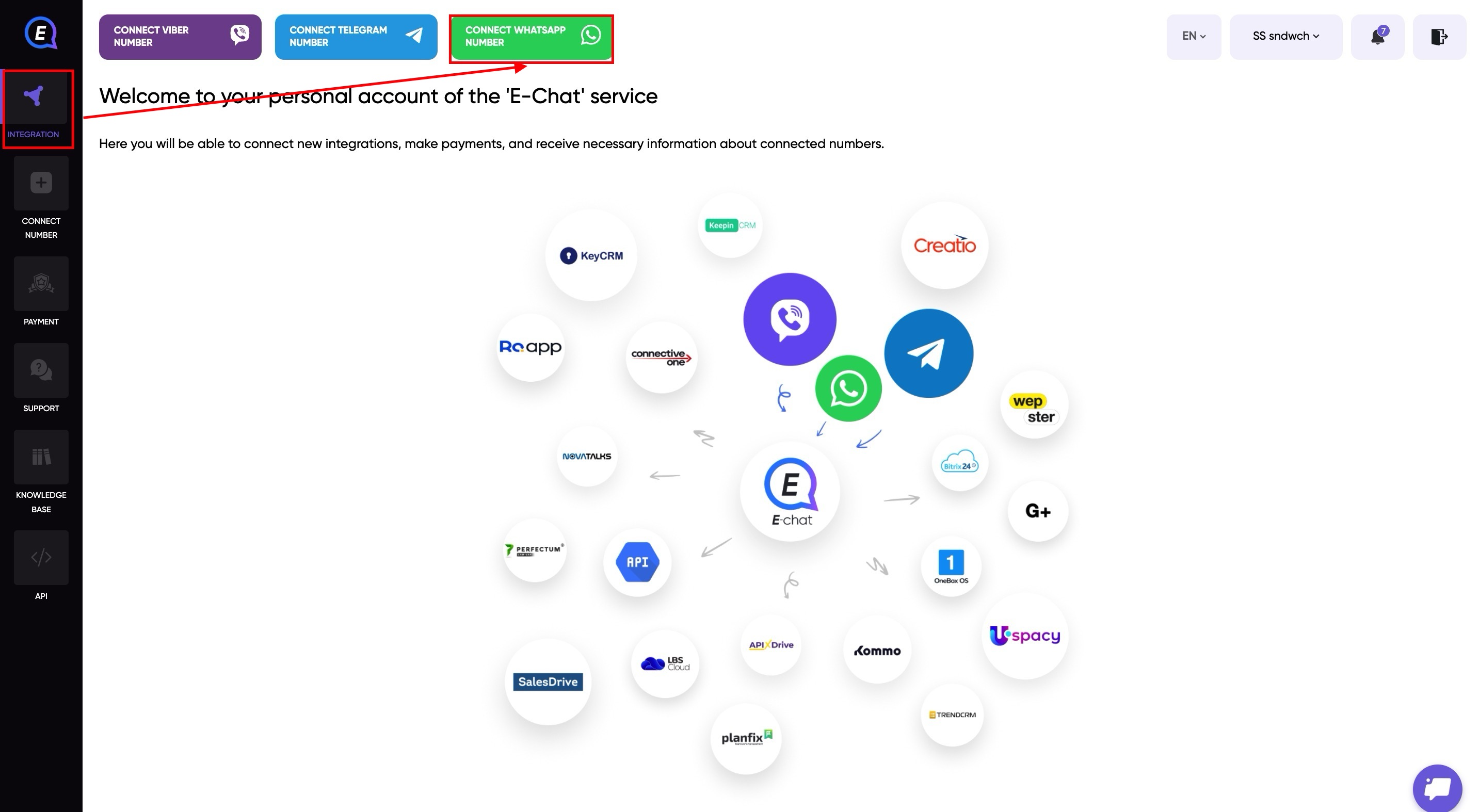 Ключ и номер будут доступны на странице "Интеграции" в E-chat.