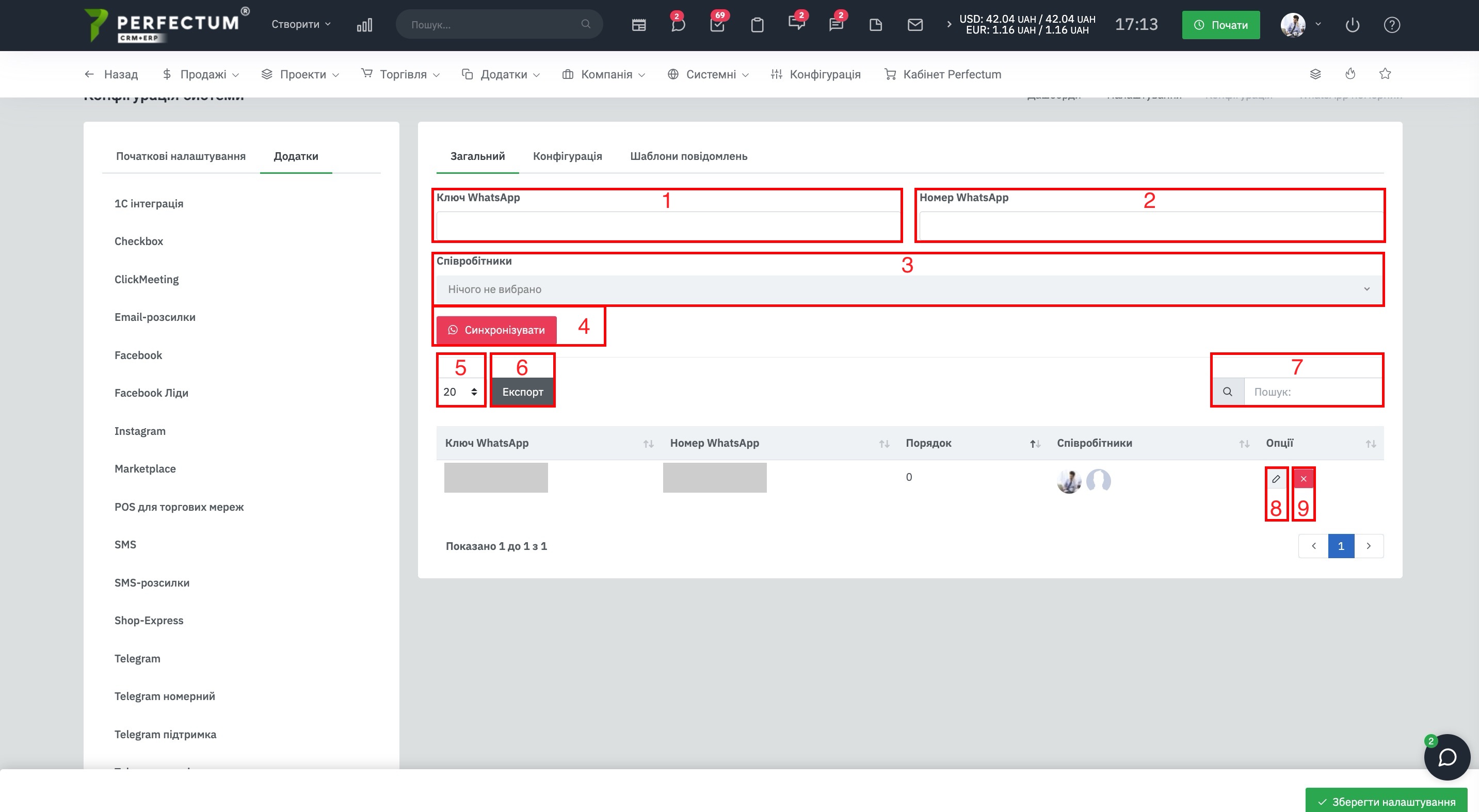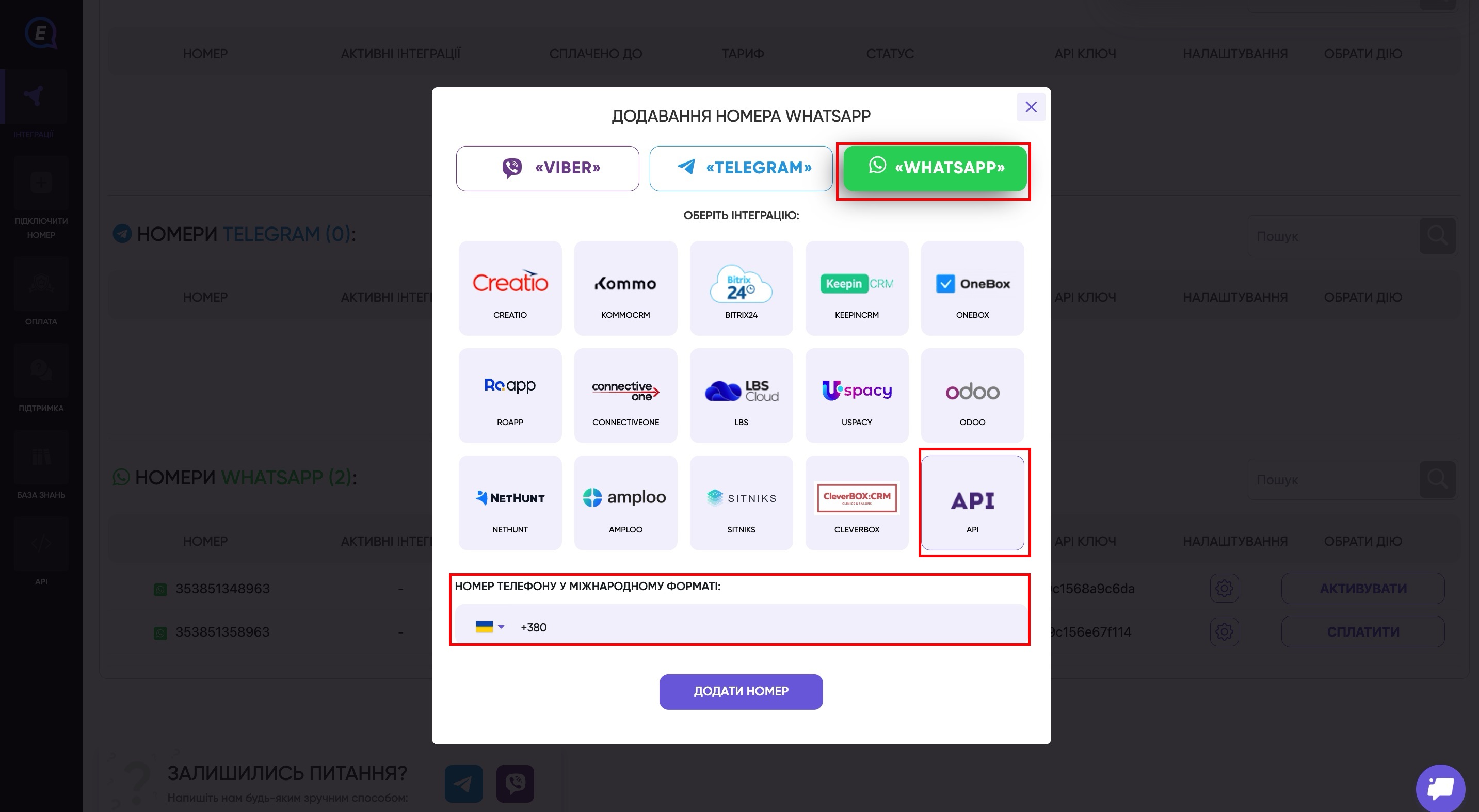 После добавления номера необходимо указать "Ключ WhatsApp" и "Номер WhatsApp" в системе.