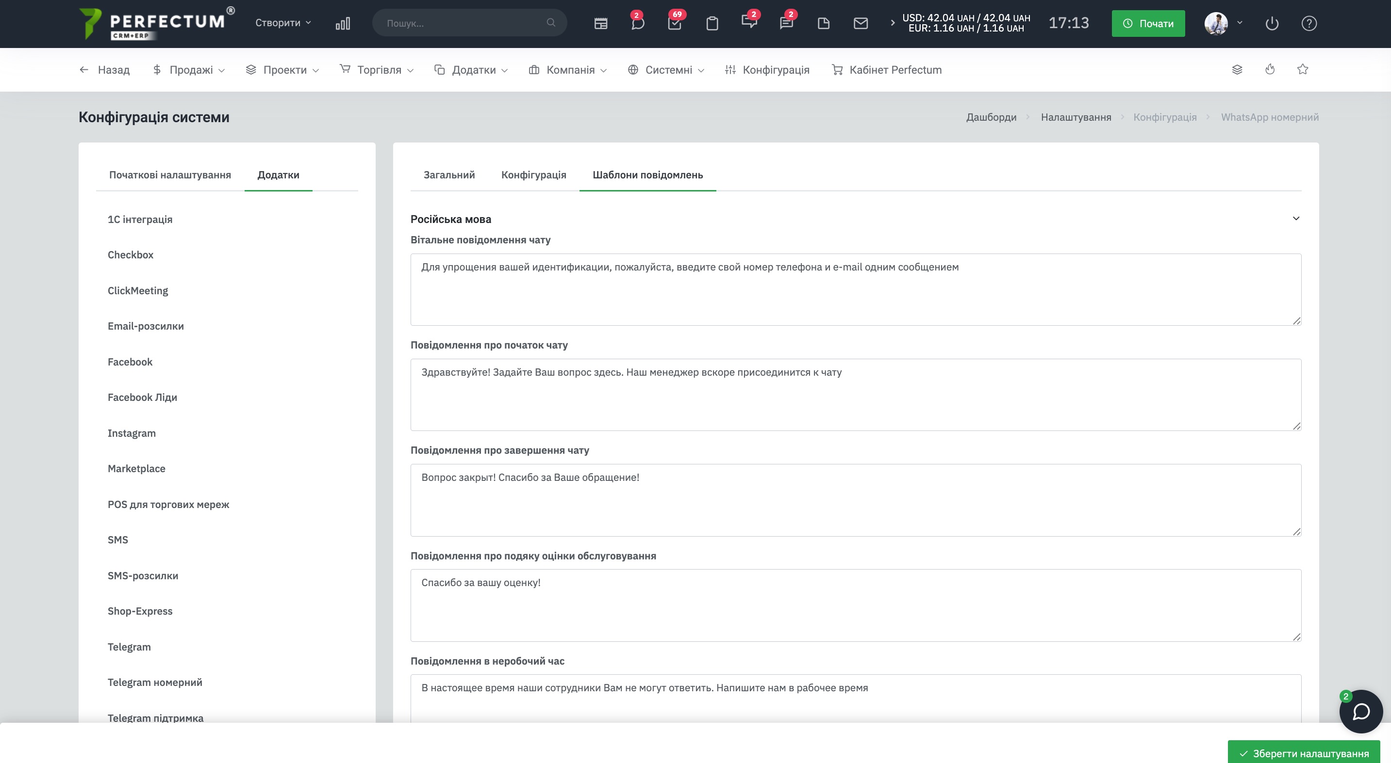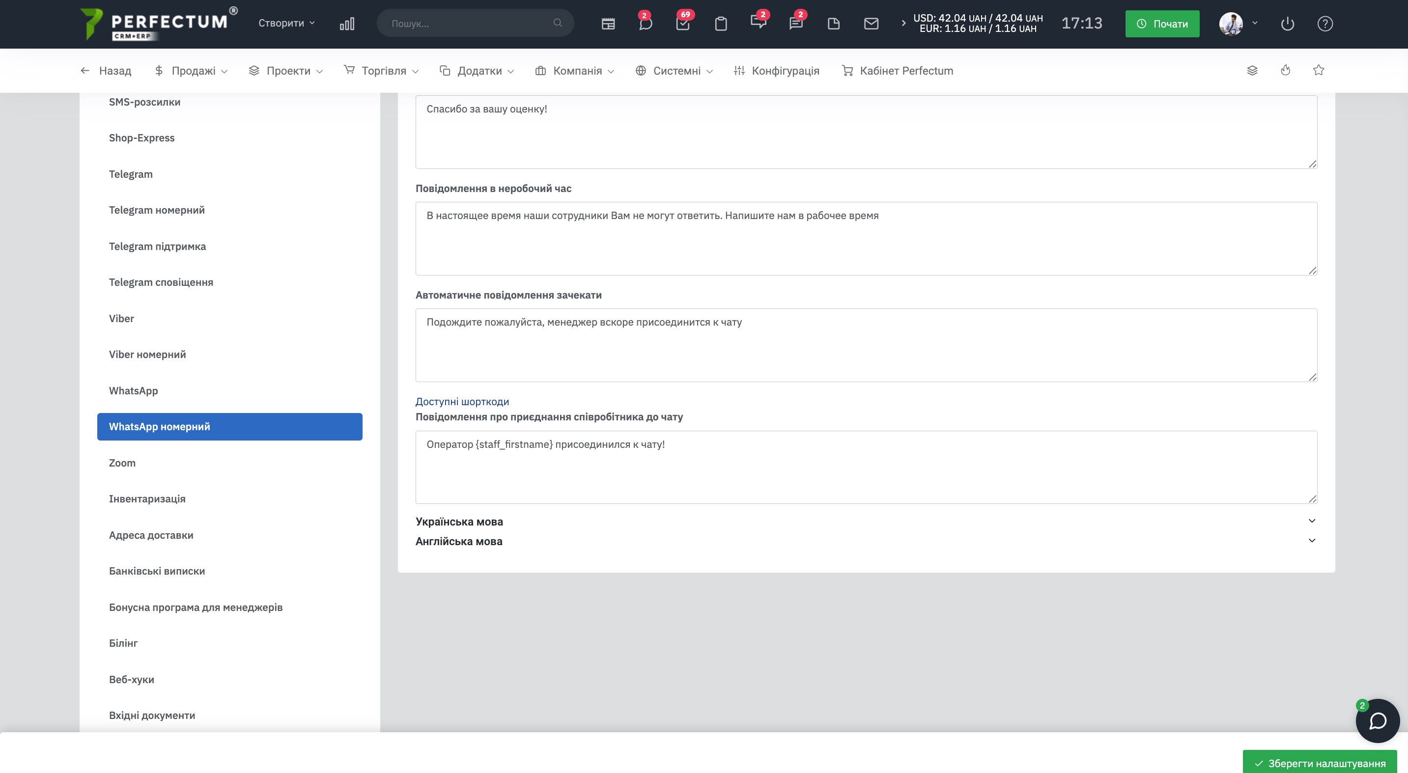 Важно! Шаблоны автоматических сообщений будут отправляться на языке который установлен в приложении WhatsApp у клиента. Переписка может быть на Английском языке, а шаблон может отправиться на Украинском языке если этот язык установлен в приложении WhatsApp у клиента.