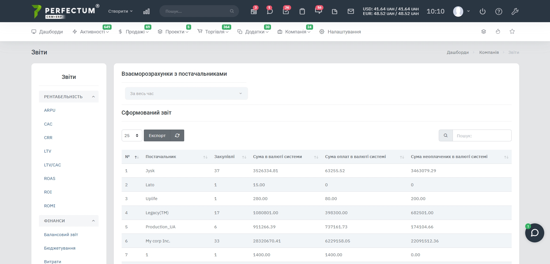 Этот отчет позволяет просматривать все взаиморасчеты компании по закупкам с поставщиками.