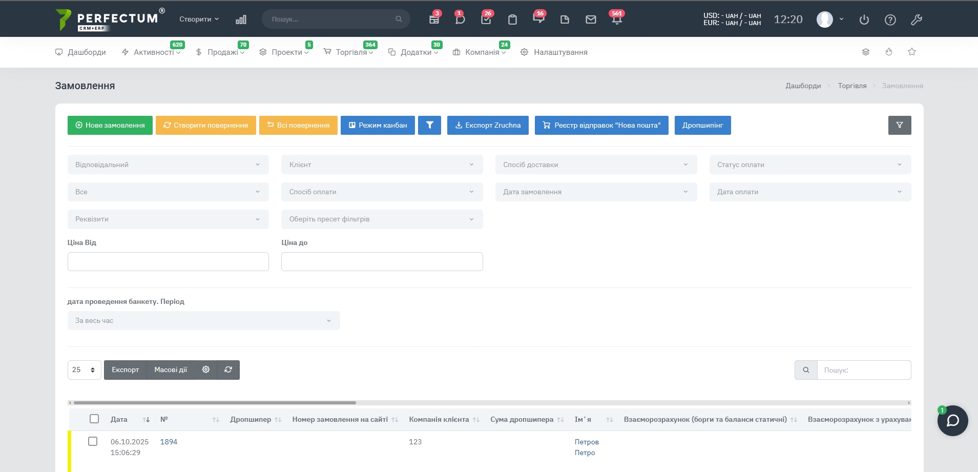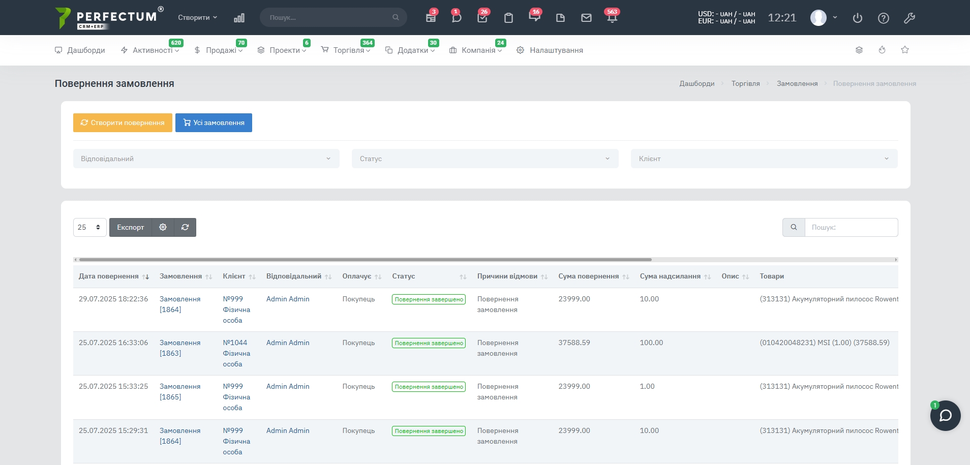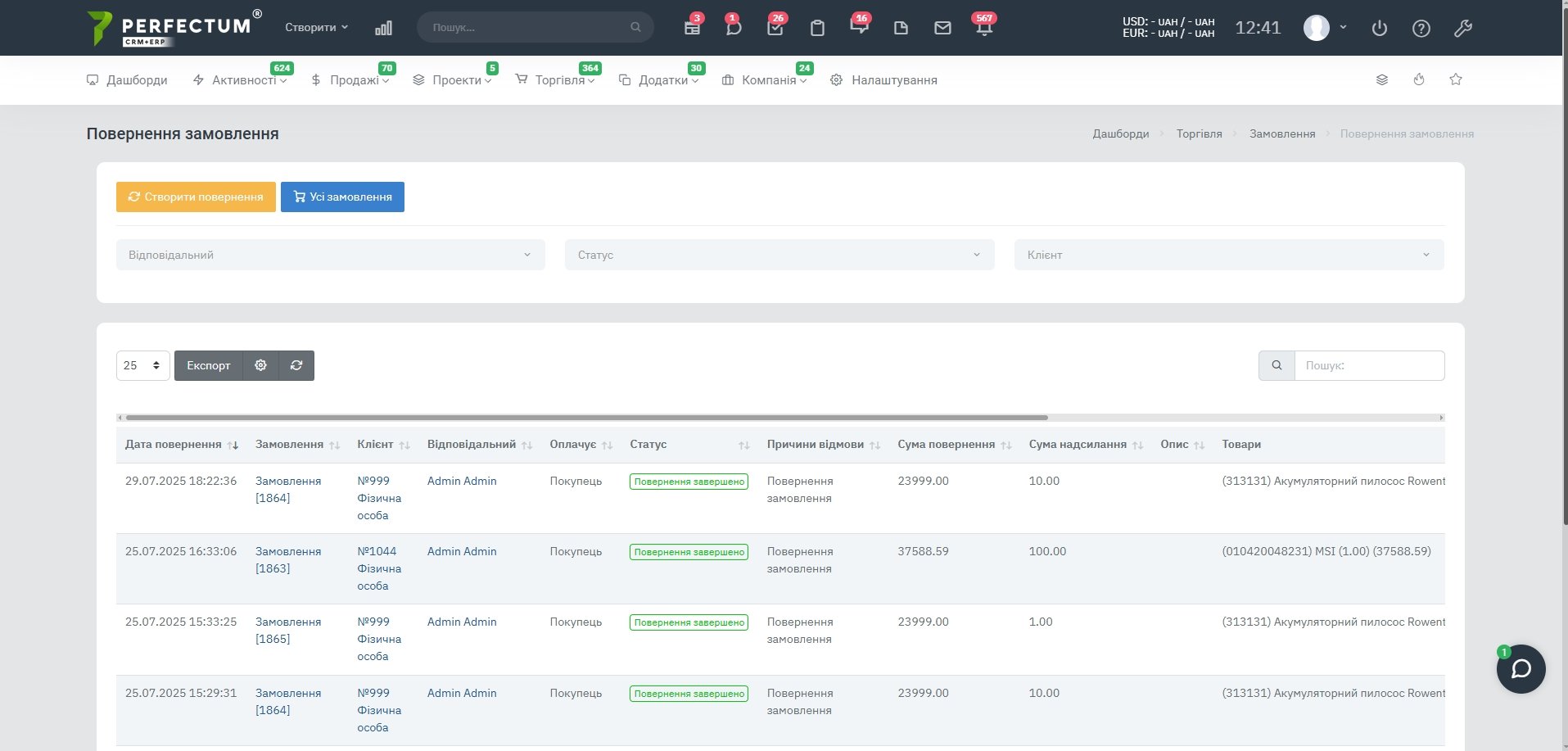 - Фильтр по “Ответственному” - для выбора ответственного сотрудника за возврат.