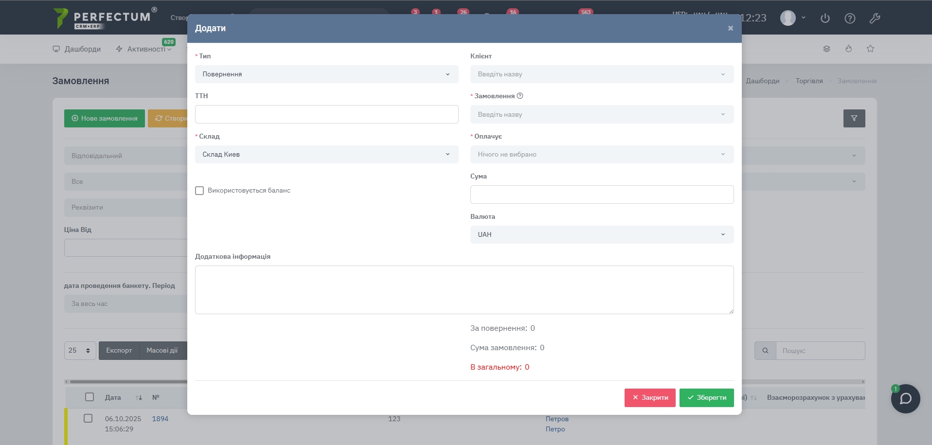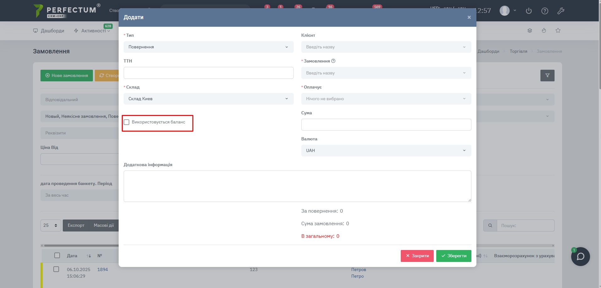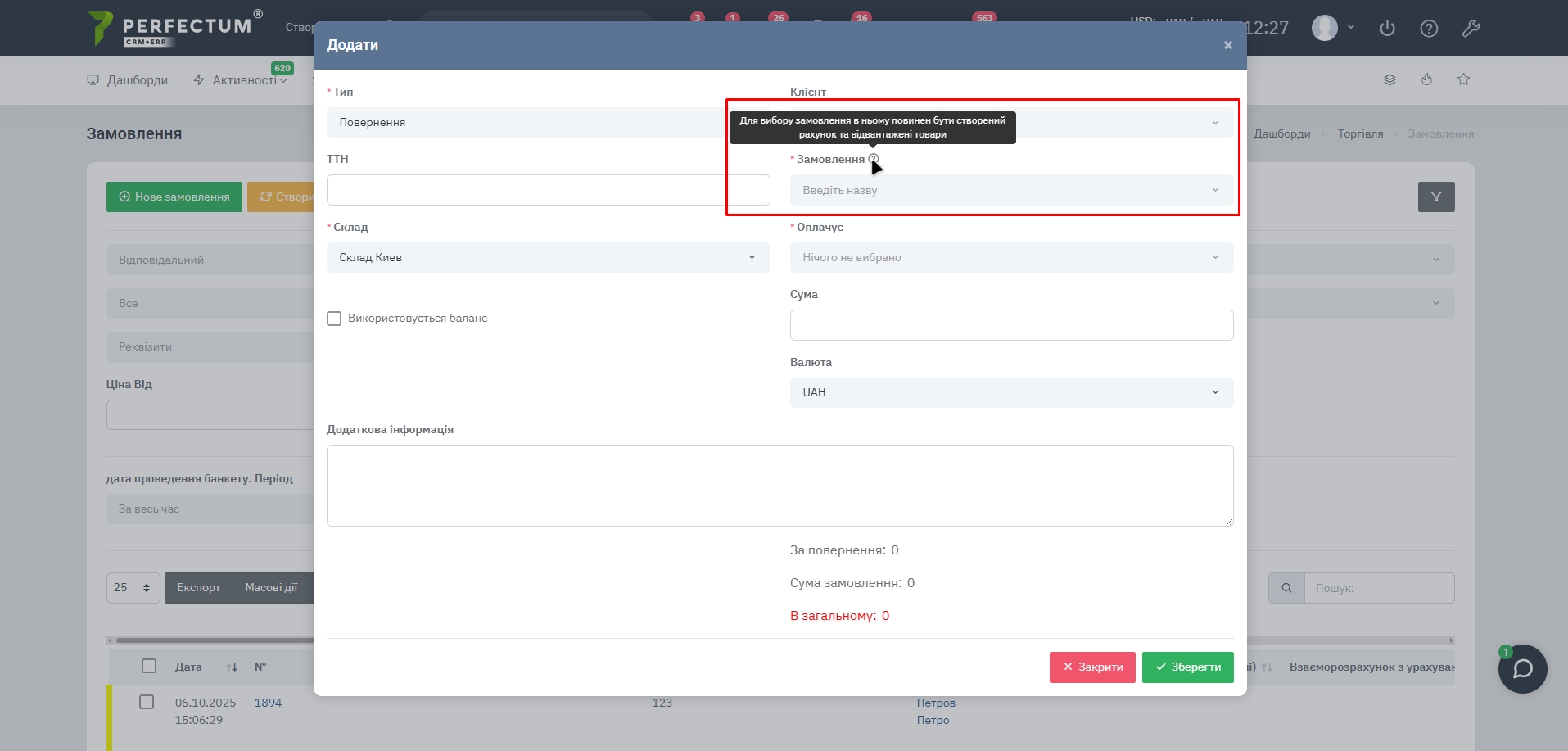 - Заказ — выбор заказа, который необходимо вернуть.