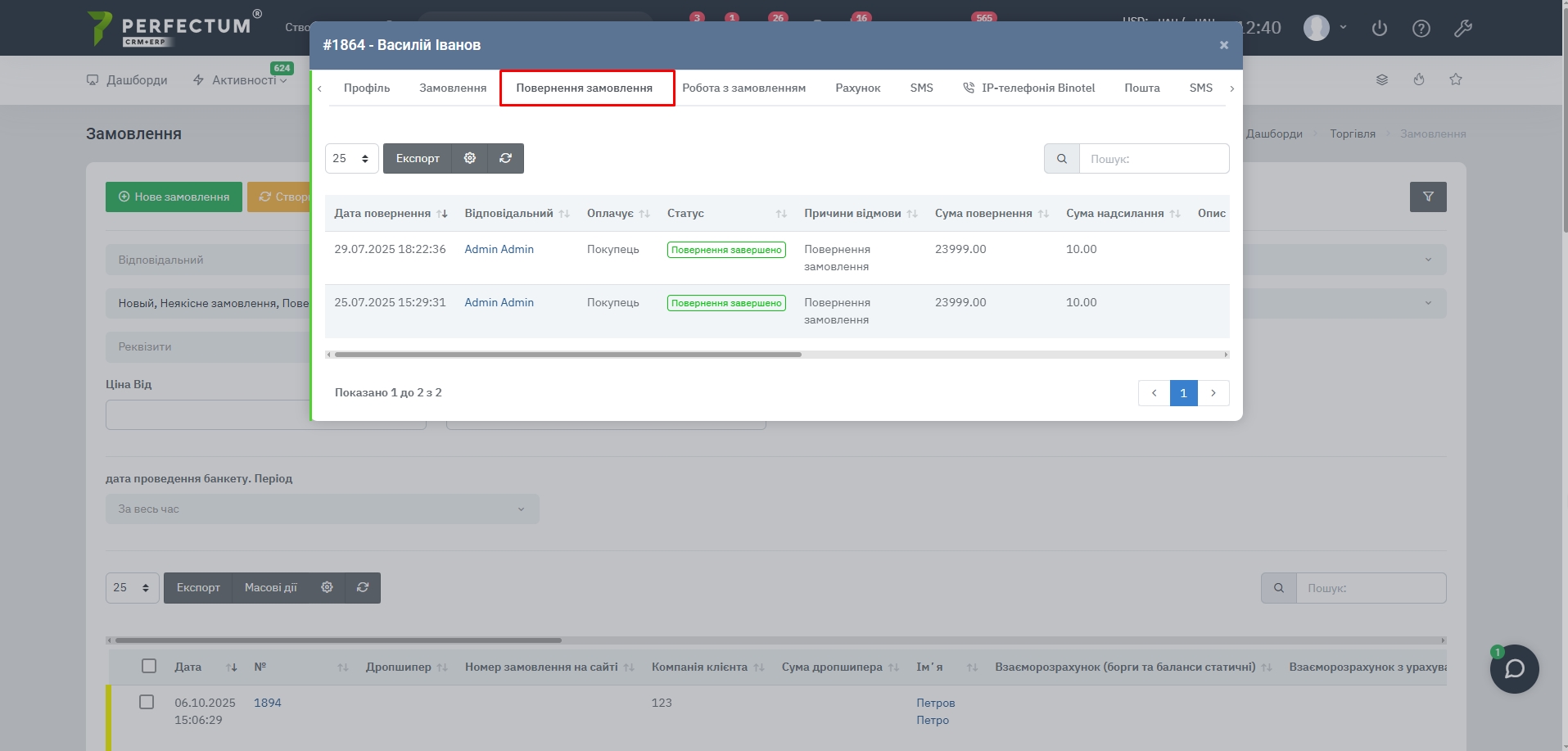 При выборе заказа ниже появляются товары заказа для возврата (их цена и количество из заказа) + также автоматически заполняется поле клиента.