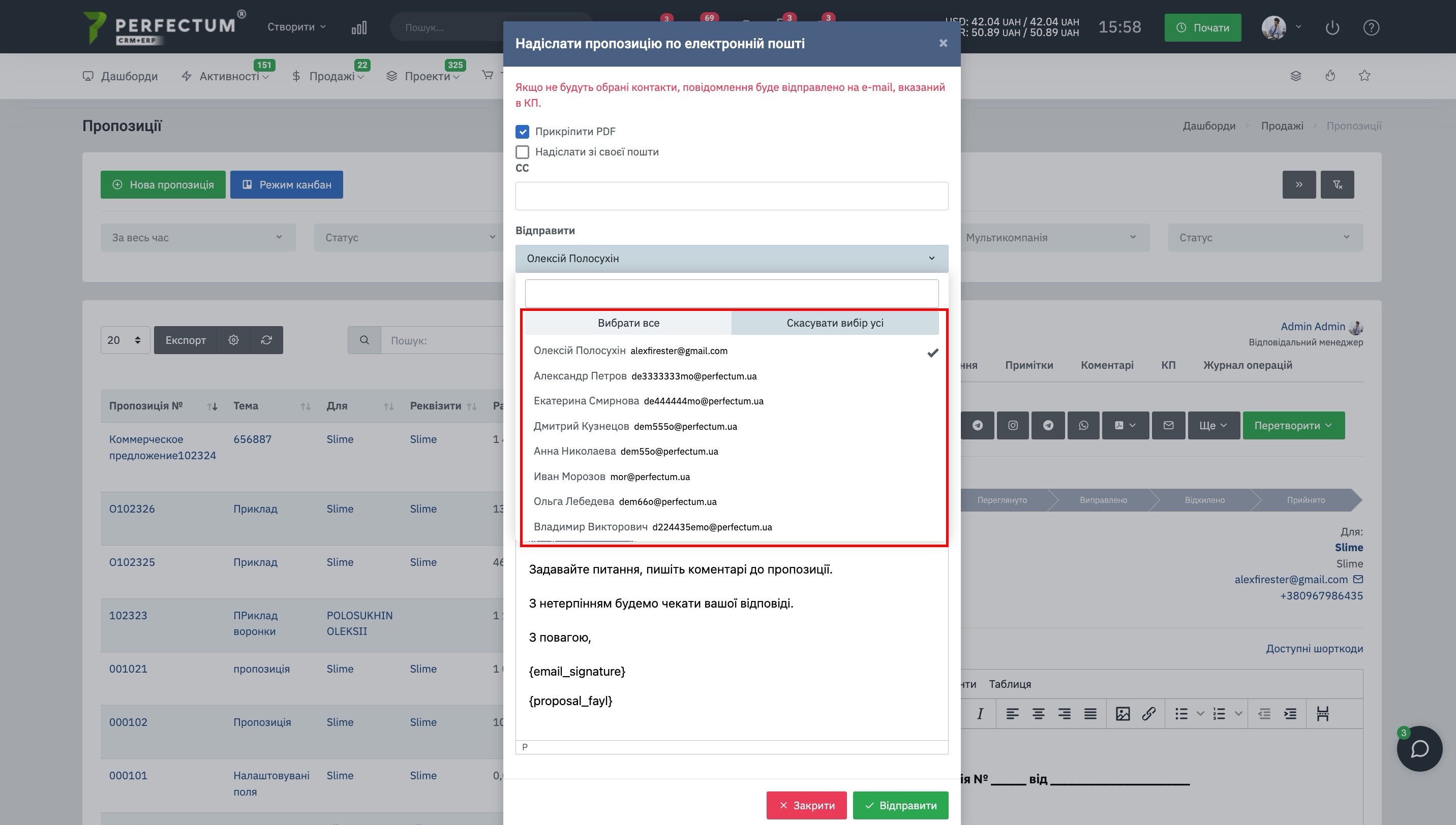 - Добавлена новая возможность в окне отправки договора, счета, акта и накладной выбрать всех/отменить выбор всех контактов клиента.