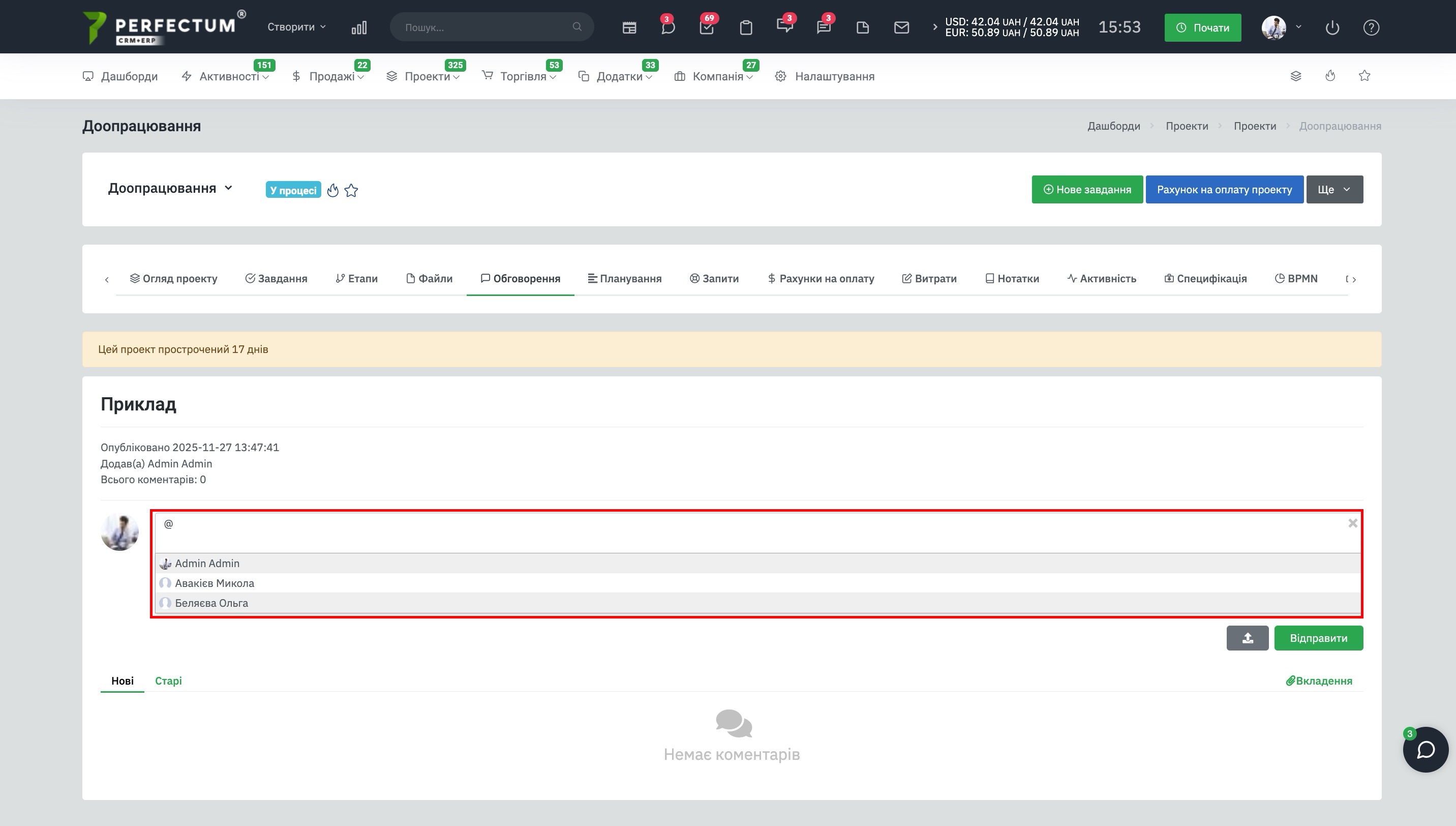 - Изменена логика работы упоминаний сотрудников в обсуждениях проектов: теперь можно отмечать только активных сотрудников.