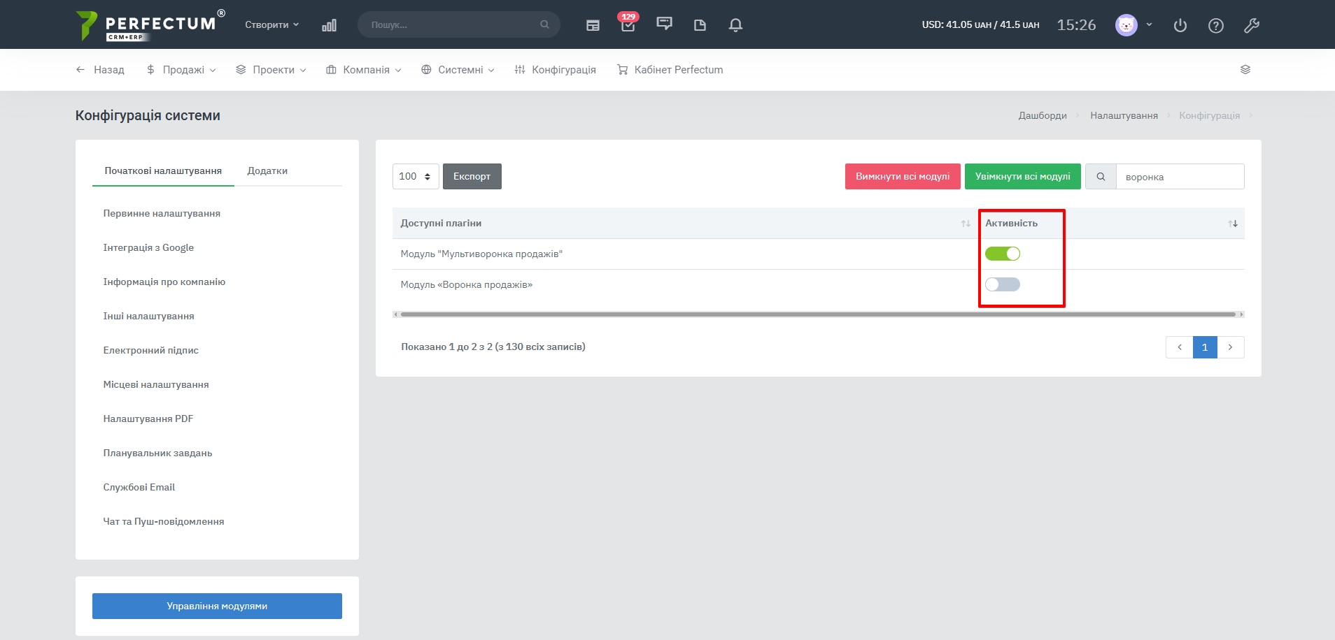- В системе реализован запрет на одновременную работу модулей "Воронка продаж" и "Мультиворонка продаж". Для работы нужно выбирать один из модулей, чтобы они не конфликтовали.