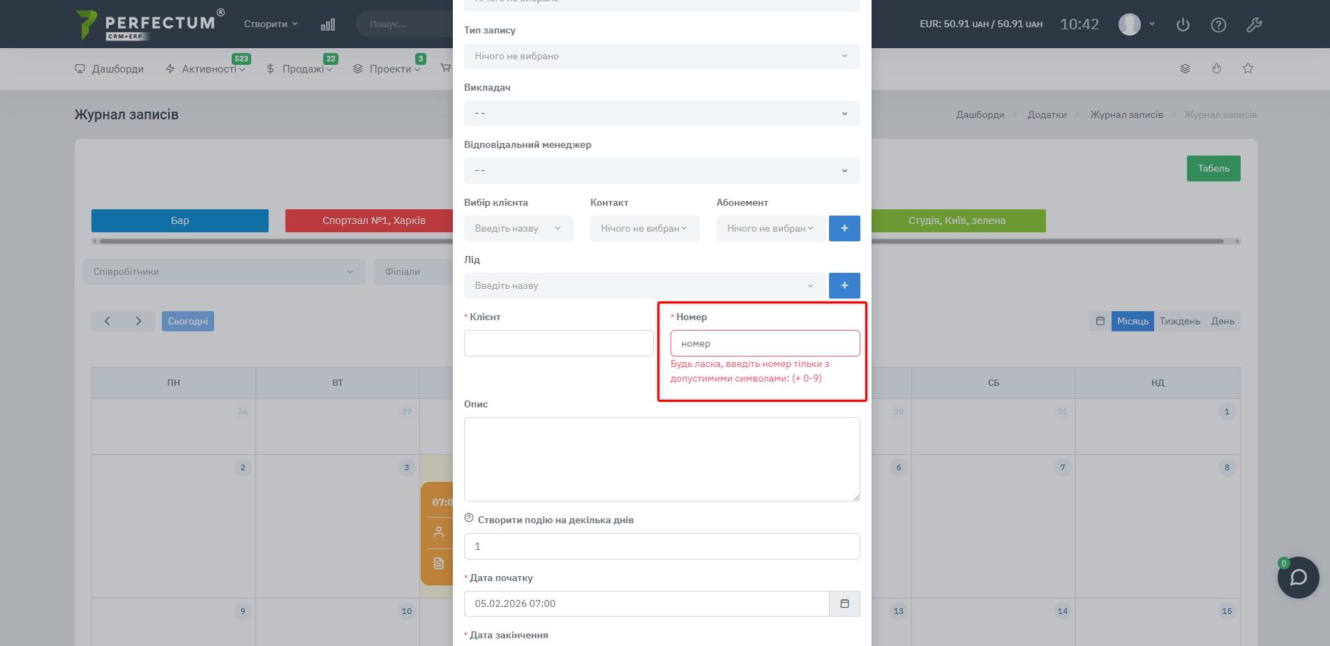 - Добавлена валидация данных для поля “Номер” в карточке события Журнала записей.