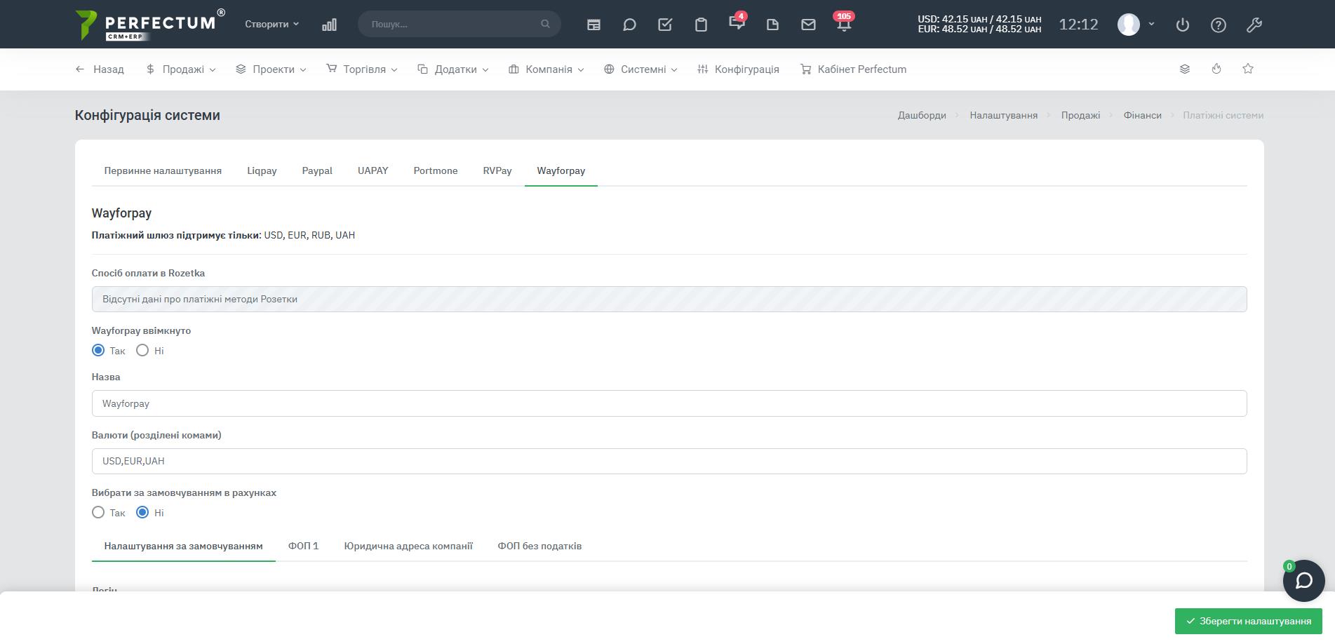 Після купівлі та встановлення модуля оплати Вам необхідно зайти в розділ "Налаштування -> Продажі -> Фінанси -> Платіжні системи". Там з'явиться новий розділ "Wayforpay".