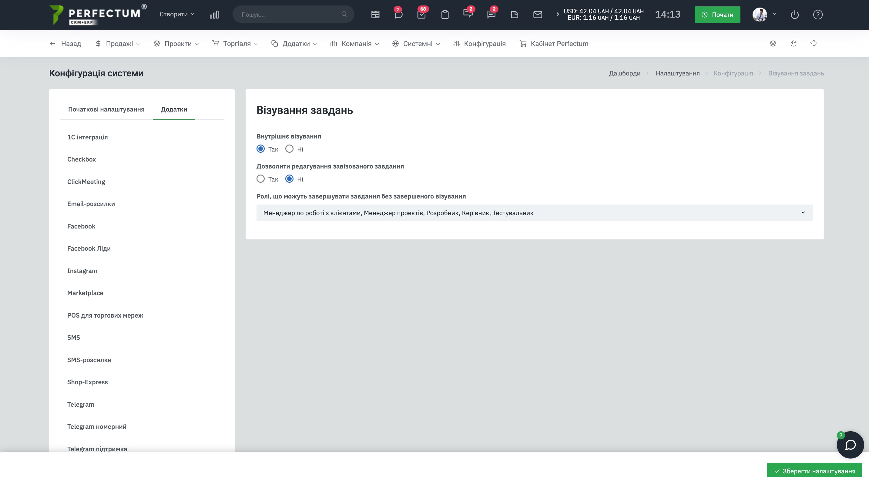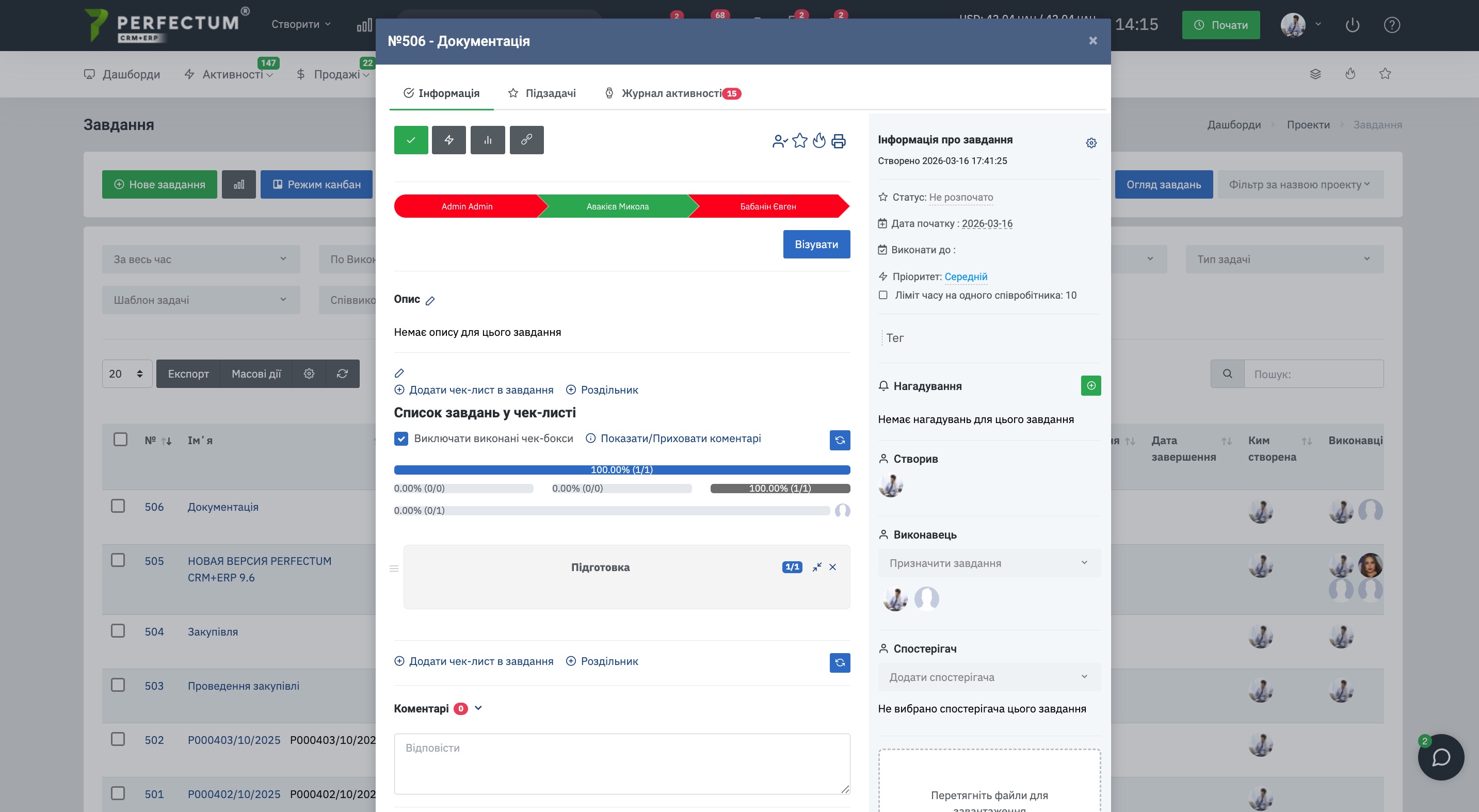 Командою Perfectum CRM+ERP було розроблено модуль "Візування завдань". Модуль розширює стандартний функціонал завдань та дозволяє налаштовувати процес узгодження завдань різними співробітниками. У модулі можна використовувати послідовне або паралельне візування, що дає можливість організувати узгодження відповідно до бізнес-процесів компанії.
