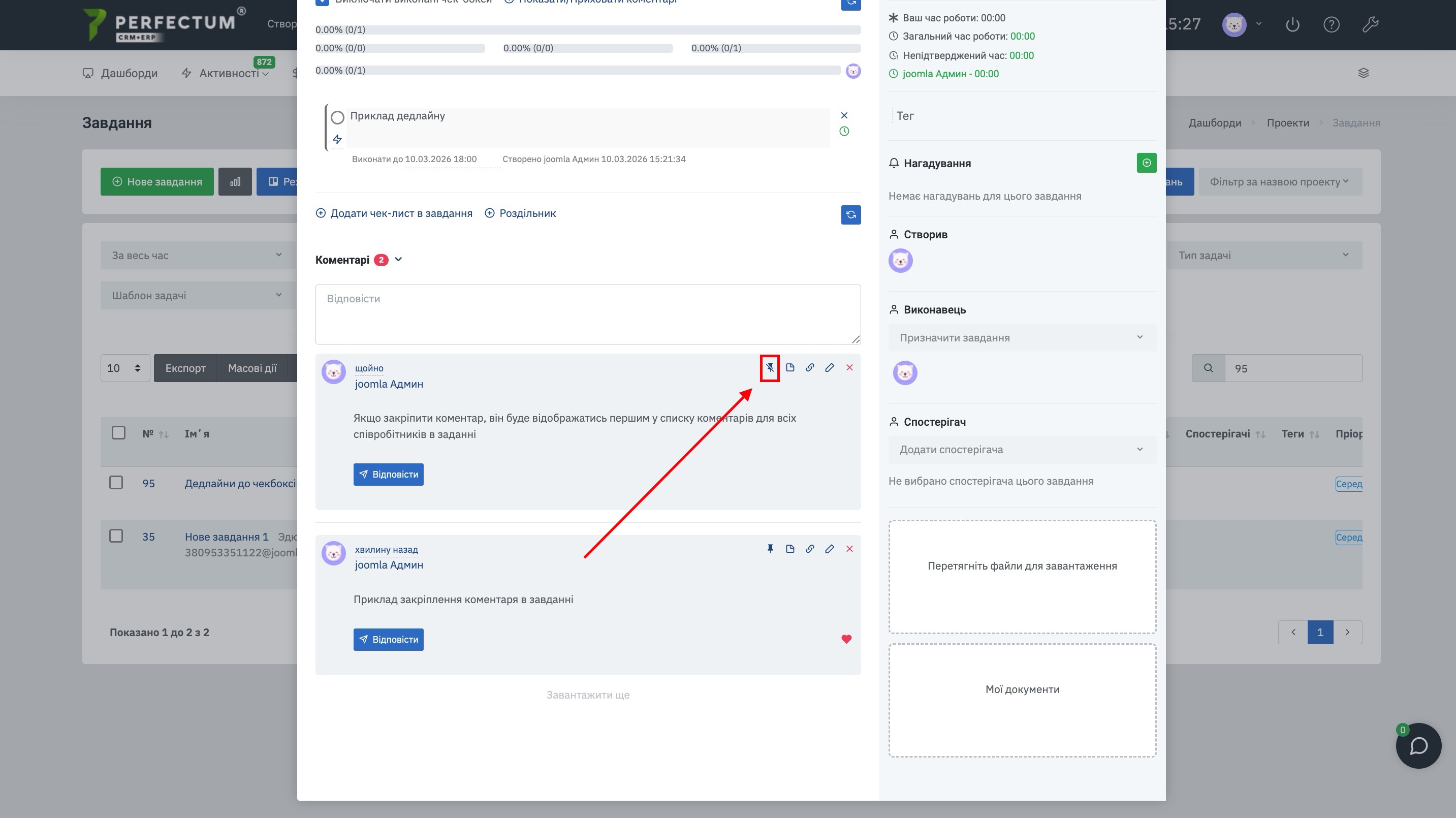 - Додано нову можливість закріплювати коментарі у завданнях. Закріплені коментарі відображаються першими у списку та видно всім учасникам завдання.
