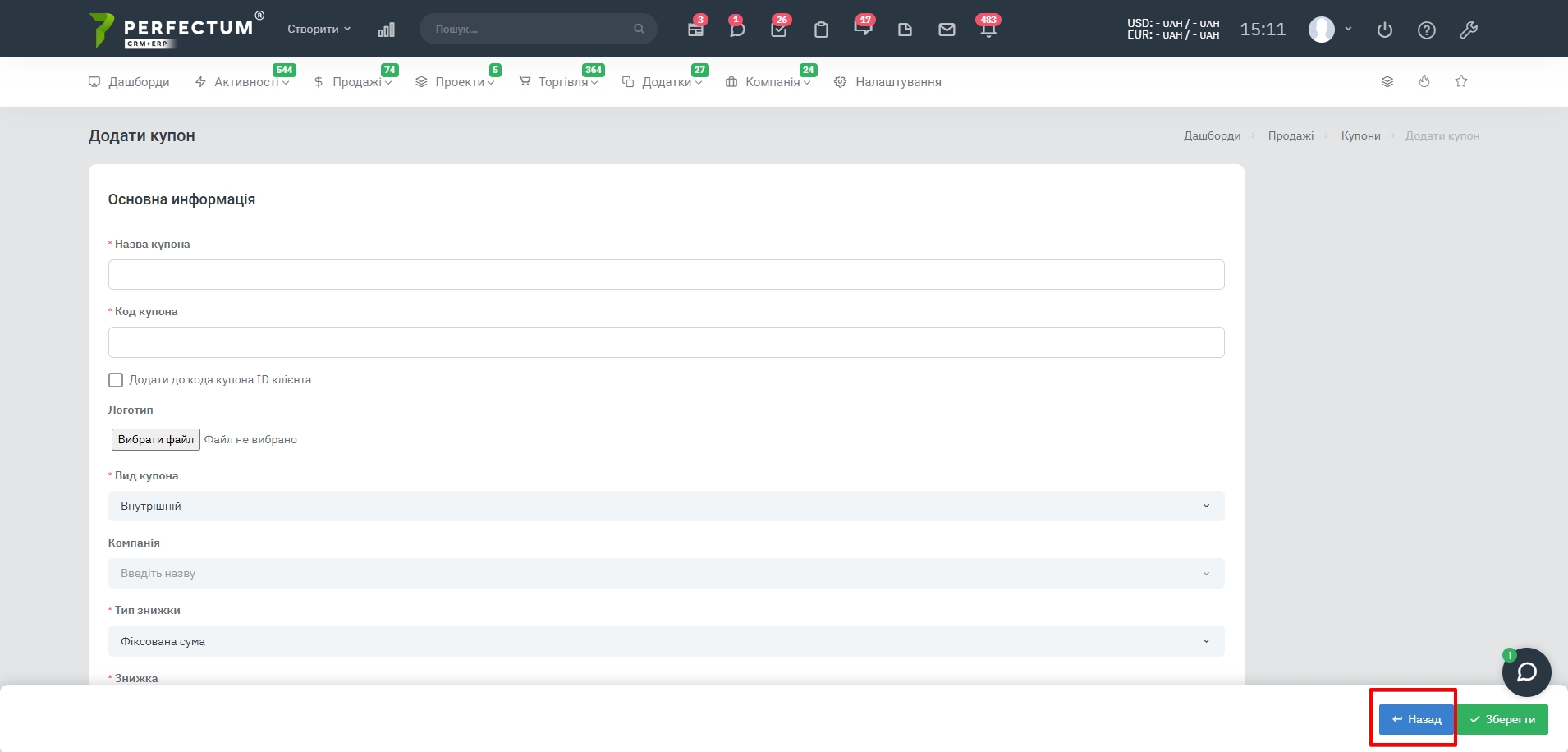 - В форму створення купона додано кнопку “Назад” для змоги повернутись до списку створених купонів.