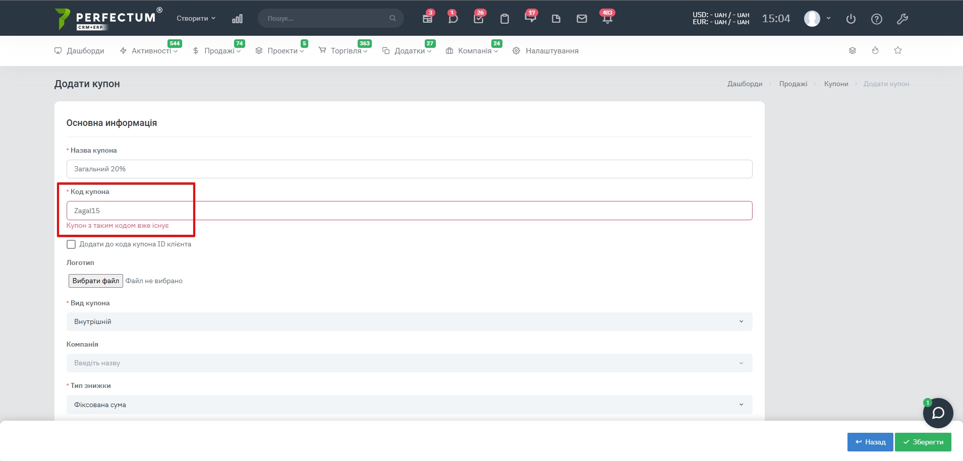 - Додана перевірка на унікальність купона при його додаванні. При знайденні збігу в коді купона система видає сповіщення про це.