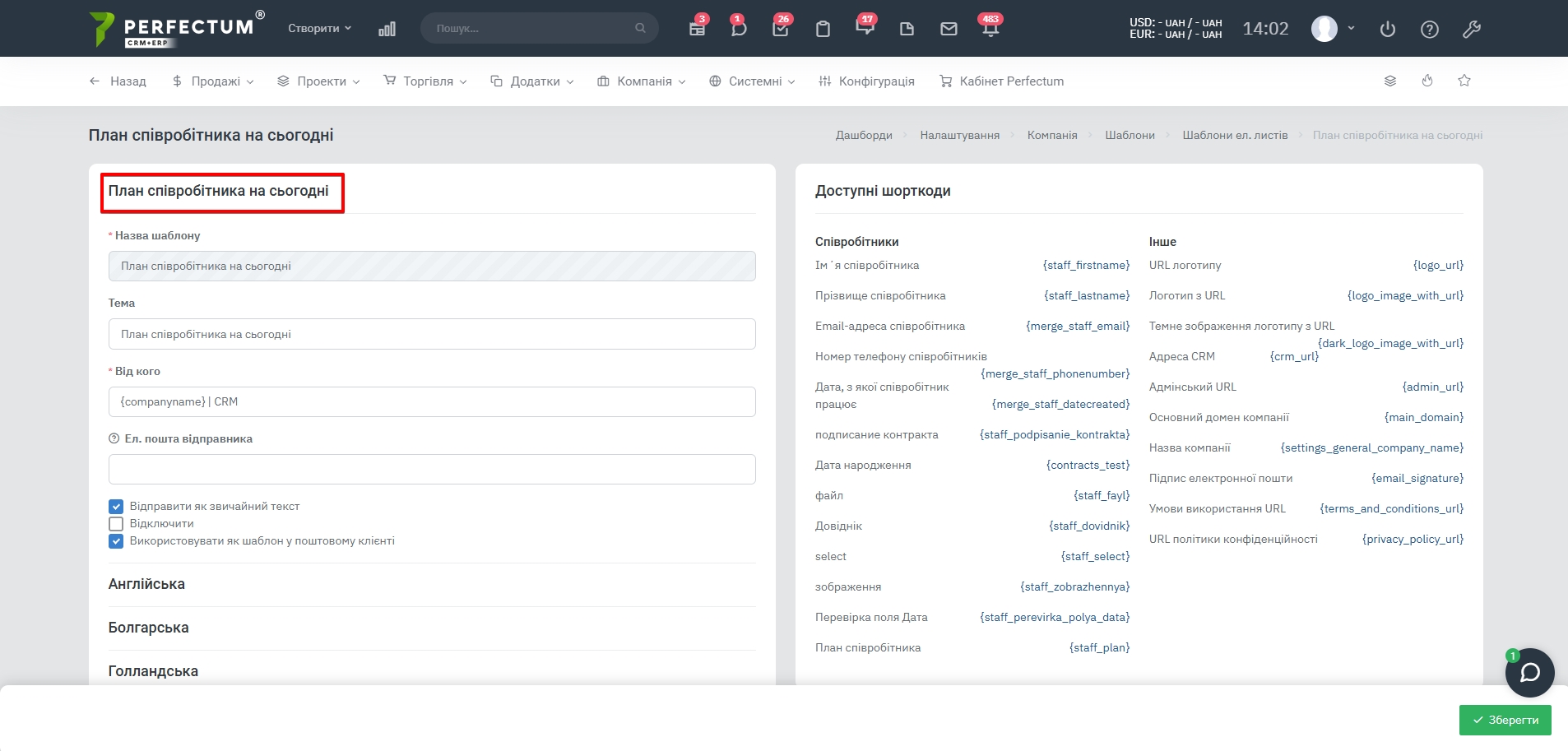 - При встановленні модуля заповнюється новий шаблон електронного листа - "План співробітника на сьогодні".