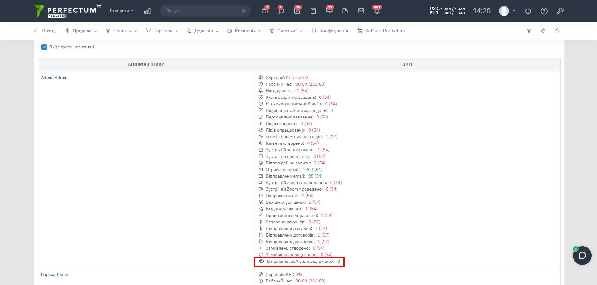 - Додано виведення результатів по звіту "Швидкість відповіді в чатах". Дані "Середній час відповіді в сек." в рядку "Виконання SLA відповіді в чатах" виводяться за день, тиждень та місяць, беручись зі звіту і підсвічуються кольором, коли виконано і коли ні.