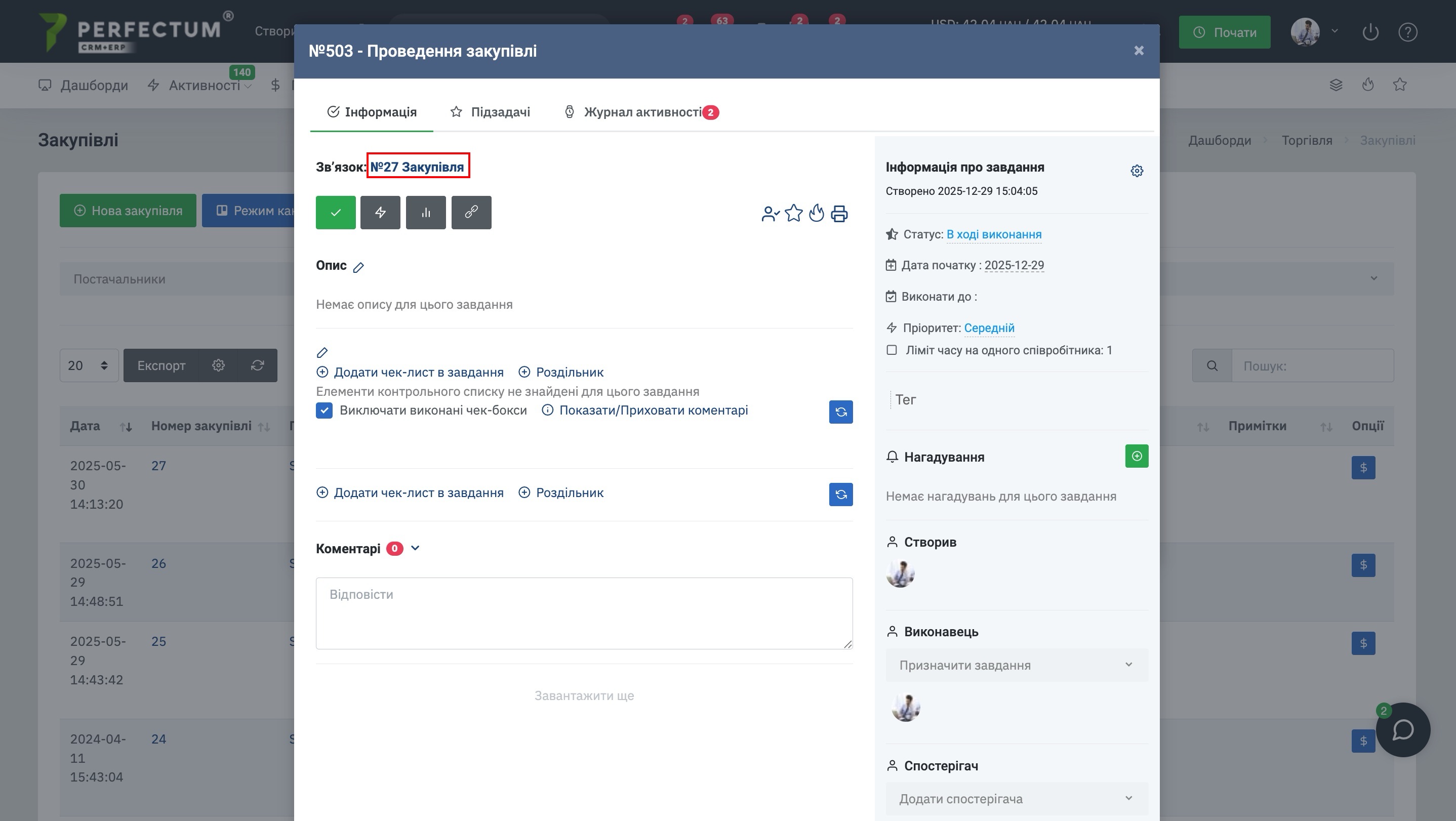 Додано нову можливість додавання вкладки «Завдання» у картці закупівлі, а також реалізовано зв'язок завдань із конкретною закупівлею.